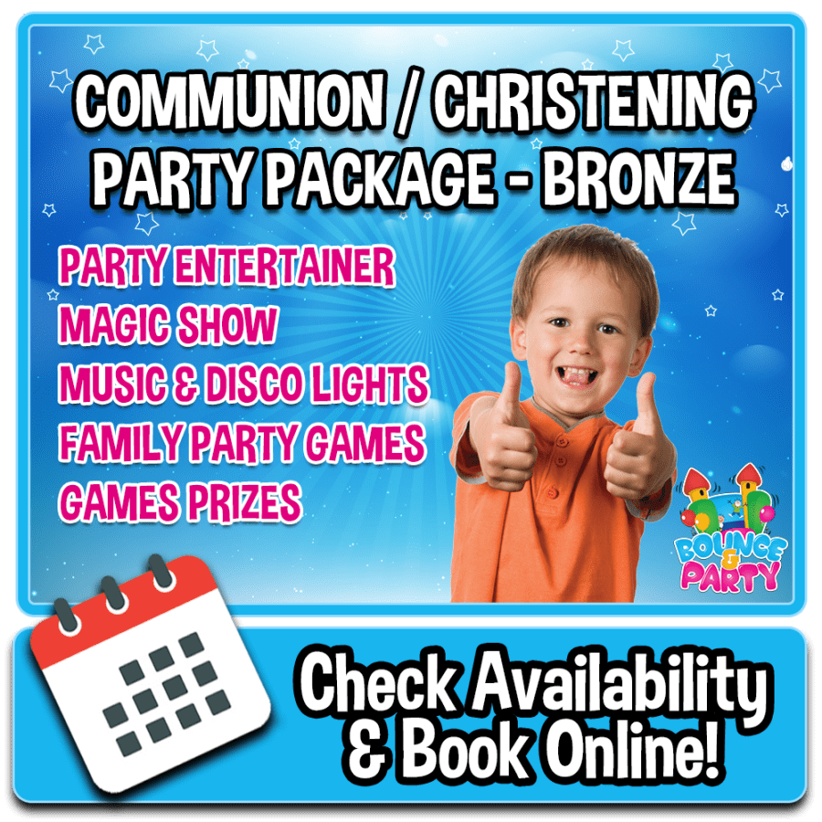 Looking for the perfect party solution in Glasgow, Govan, Carntyne, Riddrie, Easterhouse, Paisley, Maryhill, Coatbridge, Airdie, Knightswood, Kirkintilloch, Anniesland, Bearsden, South Side, Rutherglen, Cambuslang, Milngavie, Bishopbriggs, Springburn, East Kilbride, Hamilton, Motherwell, Bellshill, Pollok, Penilee, & surrounding areas? Our Communion Party Package - Bronze is available to bring joy and laughter to your event.