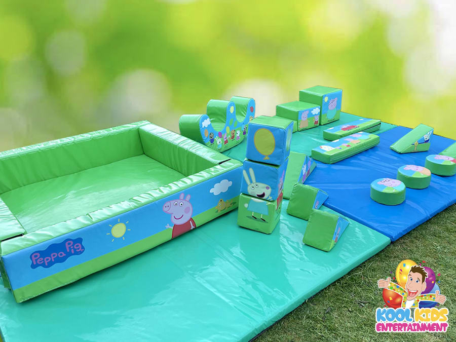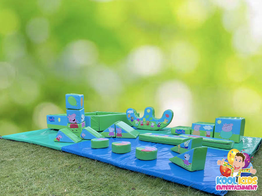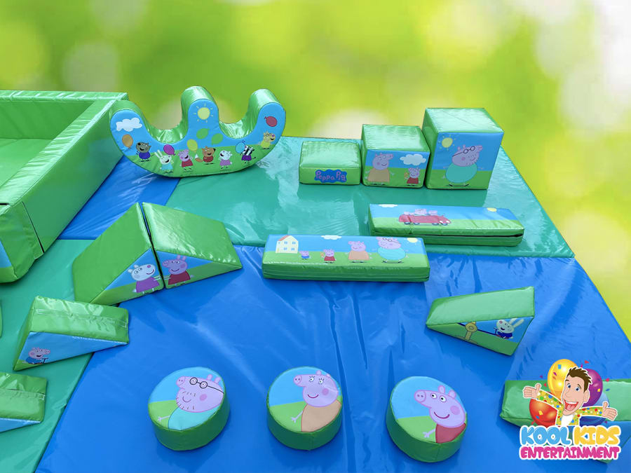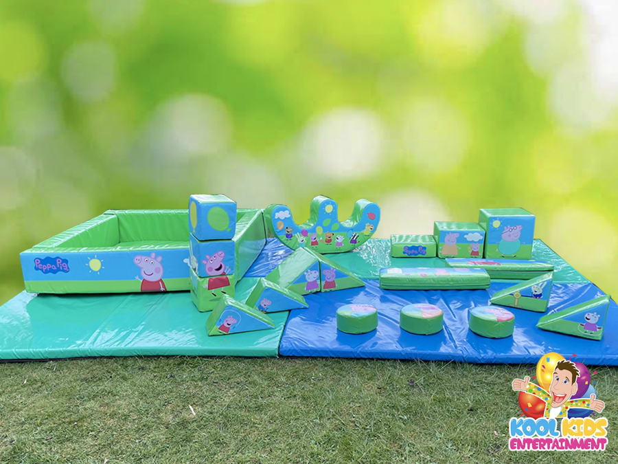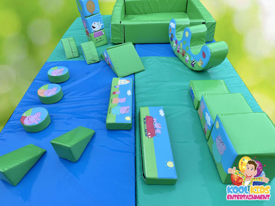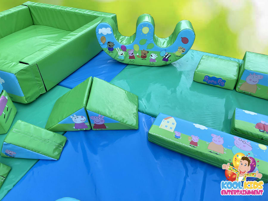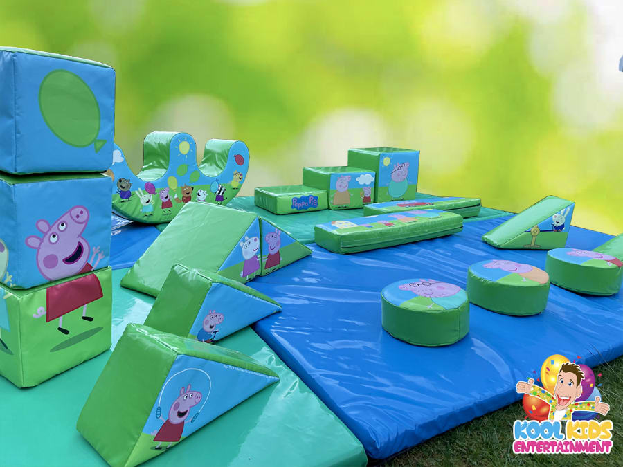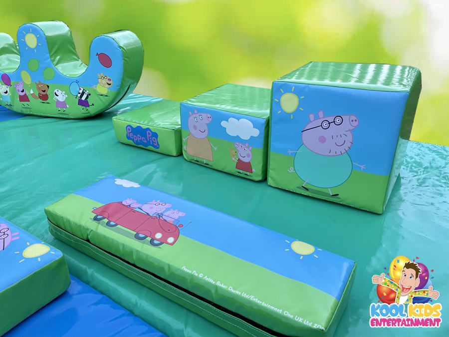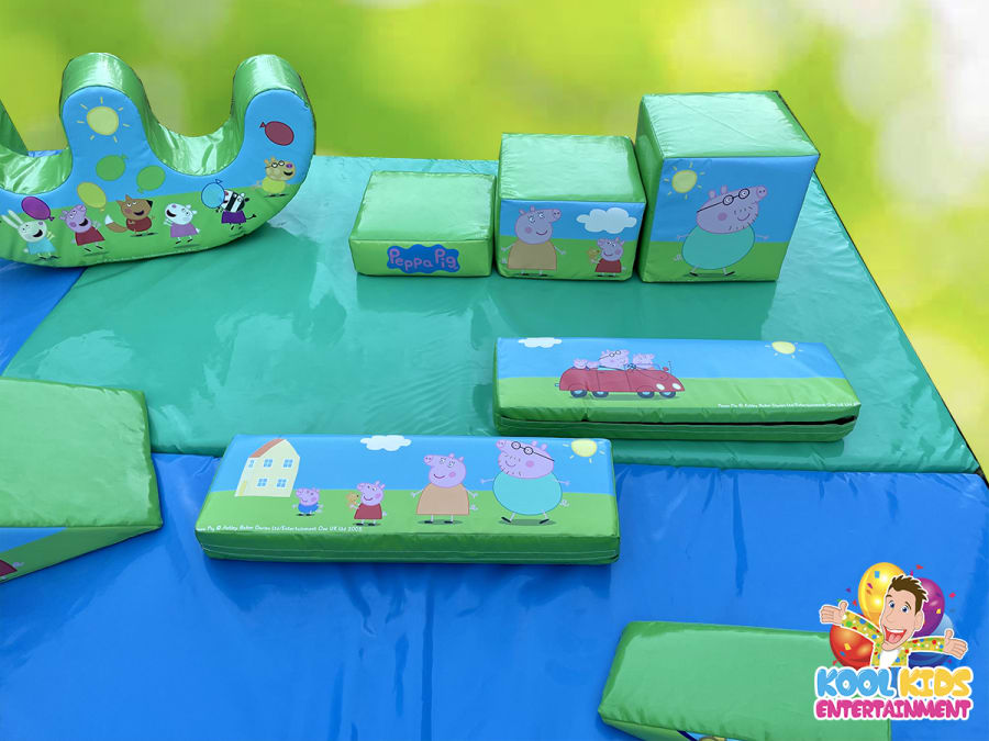 The Officially Licensed Peppa Pig Themed soft play setup is suitable for up to 7 children at a time. The soft play shapes feature themed images of your favourite Peppa Pig characters including Peppa and her little brother George.The soft play setup can be hired for venues, halls and for hire within your own home.